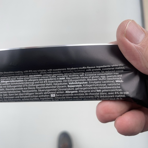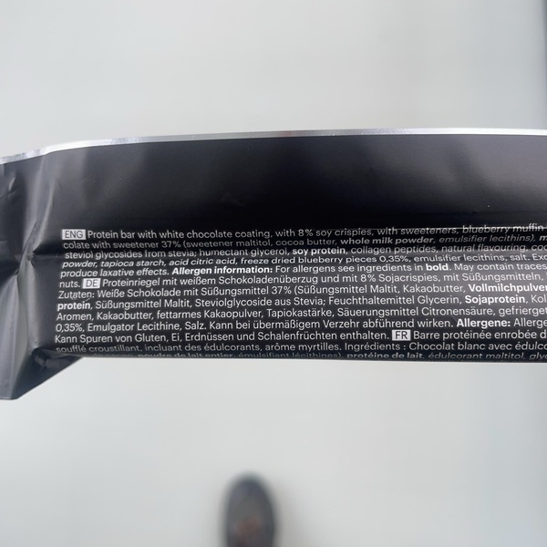 Protein bar with white chocolate coating, with 8% soy crispies, with sweeteners, blueberry muffin flavour. Ingredients: white chocolate with sweetener 37% (maltitol, cocoa butter, whole milk powder, emulsifier lecithins), milk protein, sweetener maltitol, steviol glycosides as stevia; humectant glycerol, soy protein, collagen peptides, natural flavorings, cocoa butter, fat reduced cocoa powder, tapioca starch, acid citric acid, freeze dried blueberry pieces 0.35%, emulsifier lecithins, salt. Excessive consumption may produce laxative effects.