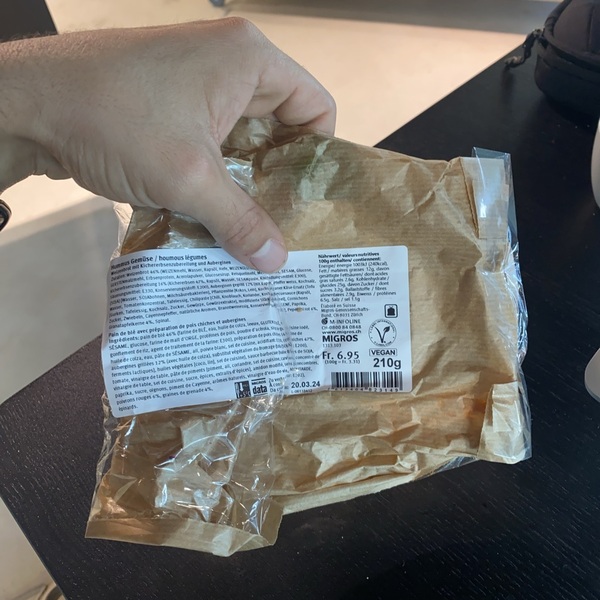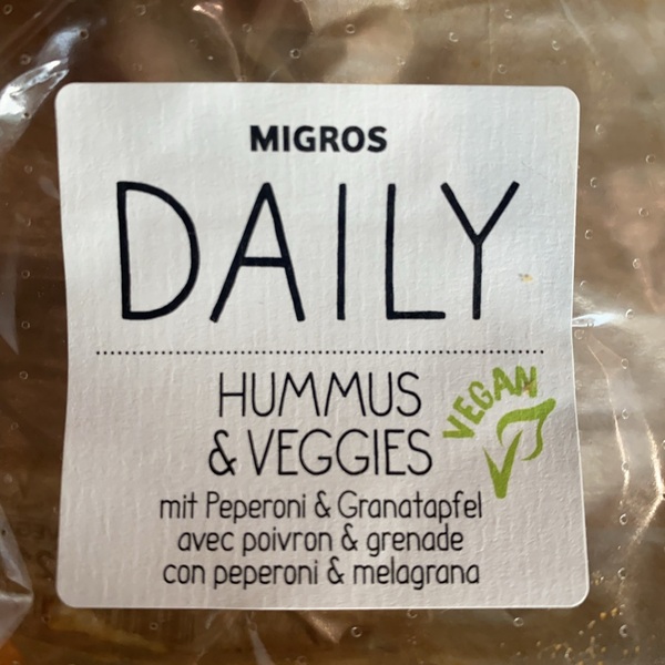 Hummus Gemüse / Houmous Légumes: Kichererbsenzubereitung und Auberginen mit Brotauflage 46%: WEIZENmehl, Wasser, Rapsöl, Hefe, SESAM, WEIZENgluten, Dextrose, SESAMmehl, Zwiebelpulver, Verdickungsmittel (Guarkernmehl, Xanthan), SESAMöl, Salz, Säuerungsmittel (Natriumacetate, Citronensäure), Mehlbehandlungsmittel (Ascorbinsäure), Erbsenprotein, Ackerbohnenmehl, Glukosesirup, Backmittel (Calciumsulfat, Calciumcitrat), SOJAbohnen, Milchsäuregärungskulturen, Kichererbsen 16%, Wasser, Rapsöl, Zitronensaft aus Konzentrat, Knoblauch, Salz, Cayennepfeffer, Sesampaste, Auberginen 12%, Rapsöl, Zwiebeln, Knoblauch, Meersalz, Säuerungsmittel (Zitronensaftkonzentrat), Verdickungsmittel (Guarkernmehl, Xanthan), Kichererbsen, Auberginen und Tomatenkonzentrat, Tomatenmark, Zwiebeln, Paprika, Sellerie, Rapsöl, Salz, Glukosesirup, Gewürze, Spinat....(some ingredients are hidden)