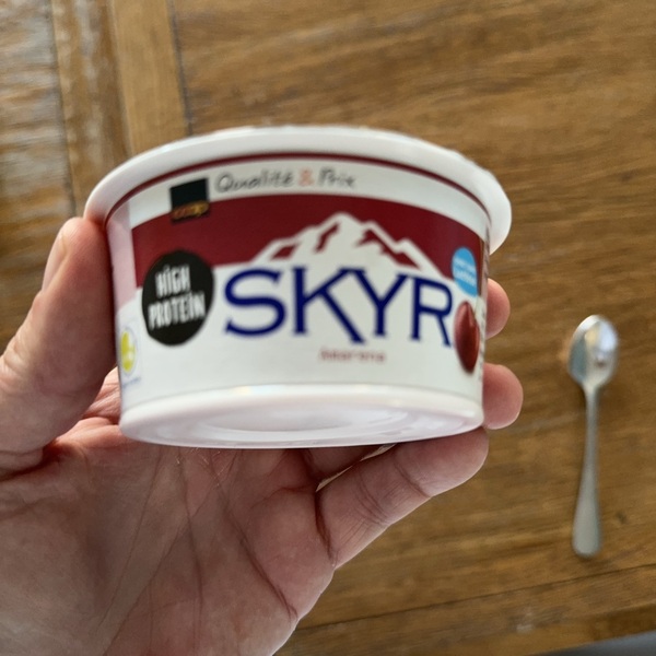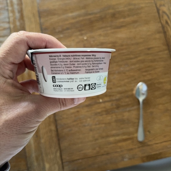 Magermilch (pasteurisiert) (Schweiz), Sauerkirschen 7%, modifizierte Wachsmastikre (E 1442), Randenfarbstoffkonzentrat, Aroma, Zitronensaftkonzentrat, Süssungsmittel (E 950, E 952), Laktase.