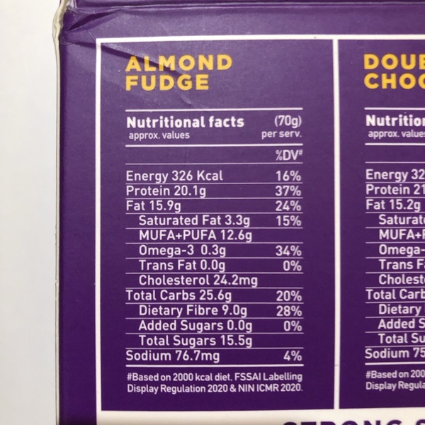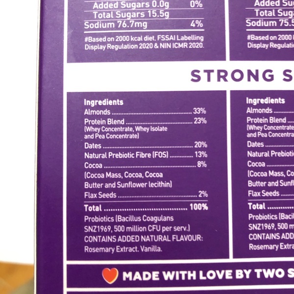 Almonds (33%), Protein Blend (Whey Concentrate, Whey Isolate, and Pea Concentrate) (23%), Dates (20%), Natural Prebiotic Fibre (FOS) (13%), Cocoa (Cocoa Mass, Cocoa, Cocoa Butter, and Sunflower Lecithin) (8%), Flax Seeds (2%). Contains added natural flavor: Rosemary Extract, Vanilla. Probiotics (Bacillus Coagulans SNZ1969, 500 million CFU per serving).