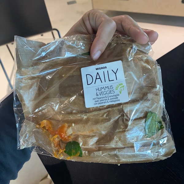 Pain de blé avec préparation de pois chiches et d’aubergines grillées : pain de blé 46% (farine de BLÉ, eau, huile de colza, levure, gluten de blé, farine de malt d'ORGE, sel, farine de malt de BLÉ, agent de traitement de la farine (E300)), préparation à base de pois chiches 34% (eau, pois chiches 16%, huile de colza, purée de sésame, amidon de maïs, sel, jus de citron concentré, épices, ail, épaississant (gomme xanthane, gomme guar), conservateur (E202)), aubergines grillées 12% (aubergines, huile de colza, épices), sauce à base de pois chiches 6% (eau, pois chiches 5%, huile de colza, amidon de maïs, épices, concentré de jus de citron, épaississant (gomme xanthane, gomme guar), sel, conservateur (E202)), poivrons rouges 6%, graines de grenade 4%, eau, pois chiches 16%, huile de colza, jus de citron concentré, ail, sel, purée de sésame, aubergines grillées 12%, oignons, sel marin, épaississant (gomme xanthane, gomme guar), concentré de tomates, tomate, oignons, poivrons, céleri, huile de colza, sirop de glucose, épices, épinards....(certains ingrédients illisibles et cachés)