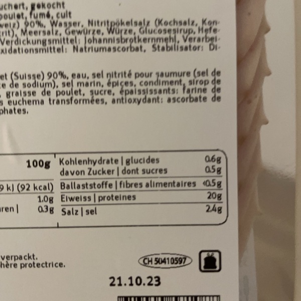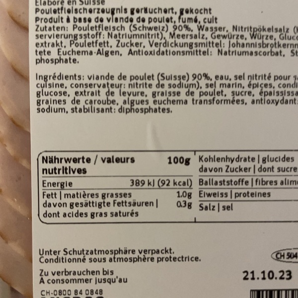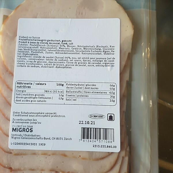 viande de poulet (Suisse) 90%, eau, sel nitrité pour saumure (sel de cuisine, conservateur: nitrite de sodium), sel marin, épices, mélange de condiments, sirop de glucose, épaississants: farine de graines de caroube, algues euchema transformées, extrait de levure, graisse de poulet, sucre, antioxydant: ascorbate de sodium, stabilisant: diphosphates.