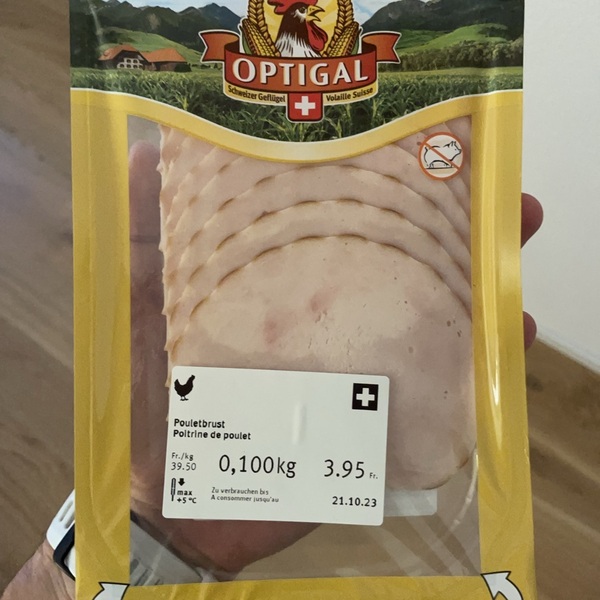 Pouletfleisch (Schweiz) 90%, Wasser, Nitritpökelsalz (Kochsalz, Konservierungsstoff: Natriumnitrit), Meersalz, Gewürze, Würzmischung, Glucosesirup, Verdickungsmittel: Johannisbrotkernmehl, Verarbeitete Euchema Algen, Hefeextrakt, Pouletfett, Zucker, Antioxidationsmittel: Natriumascorbat, Stabilisator: Diphosphate.