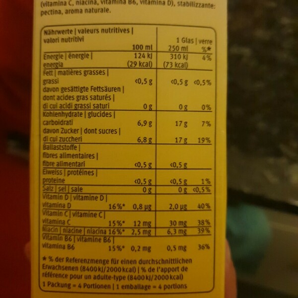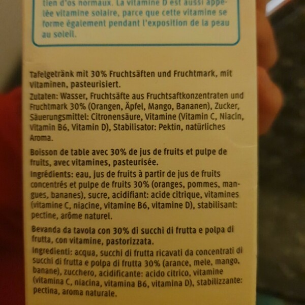 Wasser, Fruchtsäfte aus Fruchtsaftkonzentraten und Fruchtmark 30% (Orangen, Äpfel, Mango, Bananen), Zucker, Säuerungsmittel: Citronensäure, Vitamine (Vitamin C, Niacin, Vitamin B6, Vitamin D), Stabilisator: Pektin, natürliches Aroma.